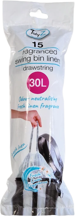 Designed for 30L swing bins, these extra-strong fragranced drawstring liners provide a reliable and hygienic solution for waste disposal. The sturdy construction handles heavier waste without tearing or leaking, while the convenient drawstring makes lifting and tying easy. Infused with a fresh linen scent, these liners help keep bins smelling clean and pleasant. Ideal for use in kitchens, offices, or other areas with medium to large swing bins, they combine practicality, hygiene, and sustainability in one product.