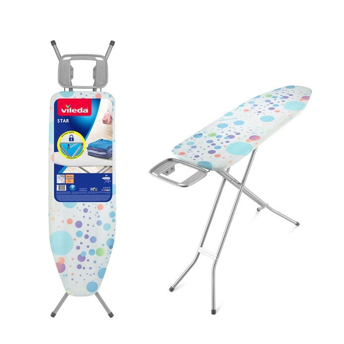 The Vileda Star Ironing Board has an ironing surface of 120 x 38cm so is ideal for all families. It has a 100% cotton cover and foam underlay to ensure a smooth surface while ironing. The Kid Safe Pull & Lift System prevents accidental closure of the board and allows you to easily adjust the height of the board to suit you while ironing.